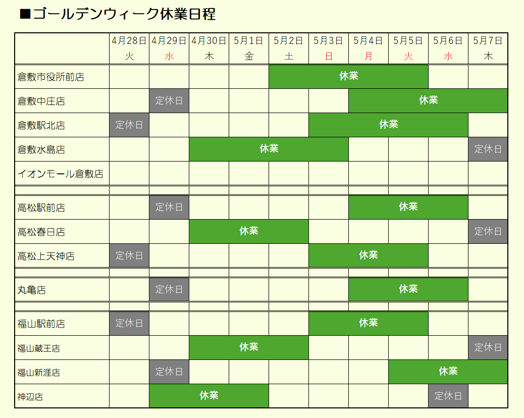 誠に勝手ながら、各店舗ごとに日程を分けてゴールデンウィーク休業とさせていただきます。